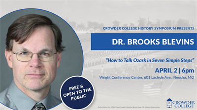 The Social Science Division is preparing to start another History Symposium series of speakers for the Spring Semester. The first speaker, Dr. Brooks Blevins will take to the podium in April where he will deliver his well-known presentation“How to Talk Ozark in Seven Simple Steps.” Dr. Blevins is the Noel Boyd Professor of Ozarks Studies at Missouri State University in Springfield and was born and raised in in rural Arkansas in the heart of the Ozarks. The free event will take place on April 2 at 6pm at the Wright Conference center, located upstairs inside the Arnold Farber Building at Crowder College Neosho (601 Laclede Ave., Neosho, MO 64850).