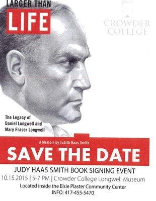 Judy Haas Smith book signing event, October 15, 5-7pm, in the Longwell Museum. Larger Than Life The Legacy of Daniel Longwell and Mary Fraser Longwellis the title of the biography written by Smith. An interview between Smith and Dr. Methvin will take place followed by book signings. Books will be available for purchase that evening for $20, with $10 being donated back to the museum. Make plans to attend.