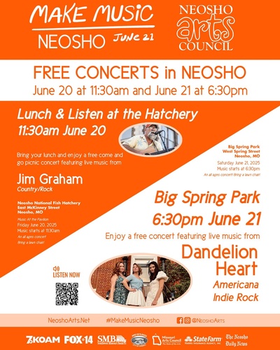 Bring our lunch and enjoy a free come and go picnic concert featuring live music from Jim Graham! Neosho National Fish Hatchery East Mckinney Street Neosho, Mo. Music at the Pavillion Friday, June 20th, 2025 Music starts at 11:30am An all ages concert, bring your own lawn chair!